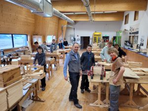 Die Ausbildung in Kuchl im Salzburger Land ist aufgrund ihrer breiten Ausrichtung rund um Holz, Technik und Wirtschaft einzigartig in Europa. Innovative Werkstücke wie Fahrräder komplett aus Holz, Surfboards oder Ski wurden hier schon entwickelt und produziert. Für das SOS Kinderdorf Seekirchen haben Fachschüler des Zweiges Tischlereitechnik im vergangenen Jahr Einrichtungsgegenstände gebaut.